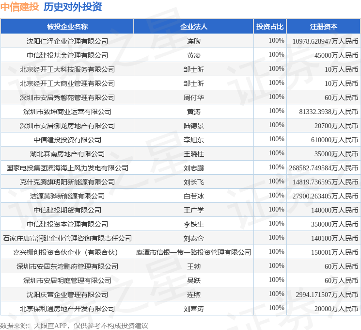 证券之星消息,根据天眼查APP显示,中信建投(601066.SH)新增一起对外投资事件,被投资公司为沈阳仁泽企业管理有限公司,法定代表人连煦,投资占比为100%。该公司从事商务服务业,注册资本为10978.628947万人民币。目前,中信建投共存在对外投资107项,投资占比前20的项目见下表: