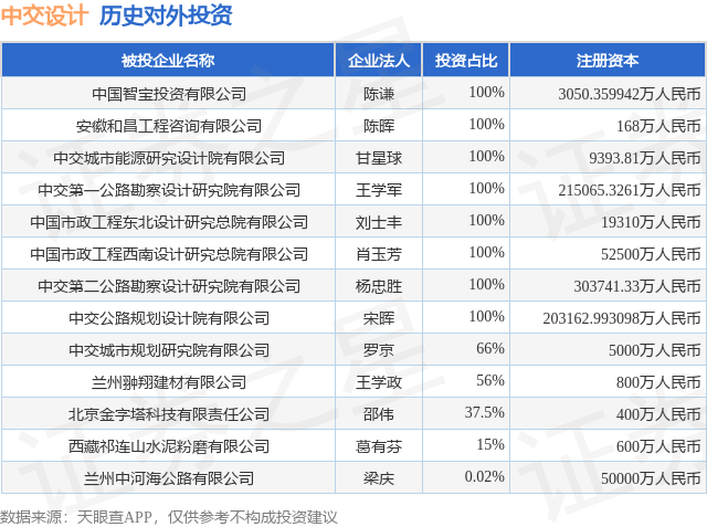 证券之星消息,根据天眼查APP显示,中交设计(600720.SH)新增一起对外投资事件,被投资公司为中国智宝投资有限公司,法定代表人陈谦,投资占比为100%。该公司从事商务服务业,注册资本为3050.359942万人民币。目前,中交设计共存在对外投资13项,详见下表:
