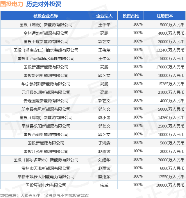 证券之星消息,根据天眼查APP显示,国投电力(600886.SH)新增一起对外投资事件,被投资公司为国投(湖南)新能源有限公司,法定代表人王伟荣,投资占比为100%。该公司从事电力、热力生产和供应业,注册资本为5000万人民币。目前,国投电力共存在对外投资118项,投资占比前20的项目见下表: