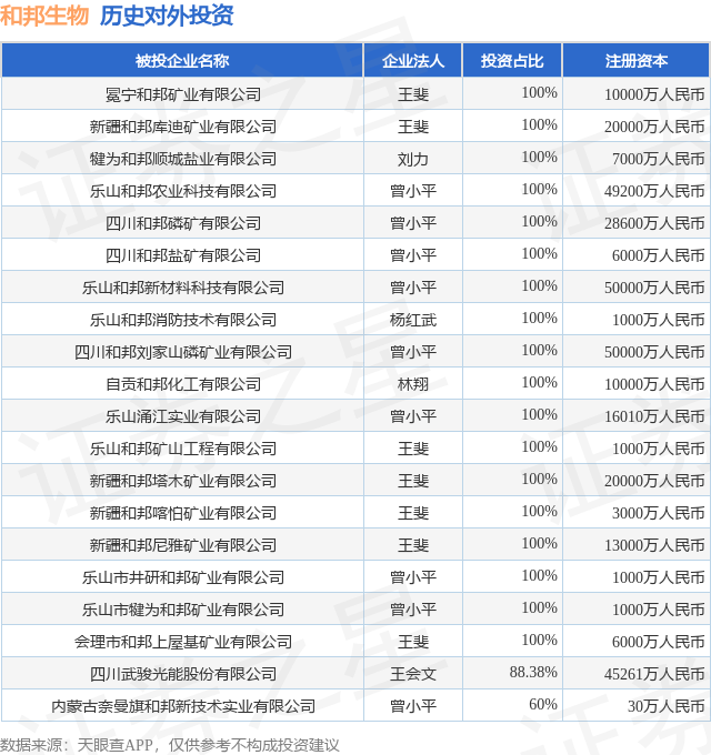 证券之星消息,根据天眼查APP显示,和邦生物(603077.SH)新增一起对外投资事件,被投资公司为冕宁和邦矿业有限公司,法定代表人王斐,投资占比为100%。该公司从事有色金属矿采选业,注册资本为10000万人民币。目前,和邦生物共存在对外投资26项,投资占比前20的项目见下表: