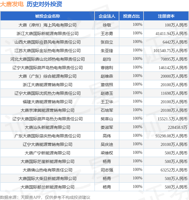 证券之星消息,根据天眼查APP显示,大唐发电(601991.SH)新增一起对外投资事件,被投资公司为大唐(漳州)海上风电有限公司,法定代表人徐敬,投资占比为100%。该公司从事电力、热力生产和供应业,注册资本为100万人民币。目前,大唐发电共存在对外投资192项,投资占比前20的项目见下表: