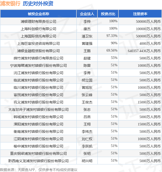 证券之星消息,根据天眼查APP显示,浦发银行(600000.SH)新增一起对外投资事件,被投资公司为四川科新机电股份有限公司,法定代表人林祯华,投资占比为1.47%。该公司从事专用设备制造业,注册资本为27392.3271万人民币。目前,浦发银行共存在对外投资208项,投资占比前20的项目见下表:
