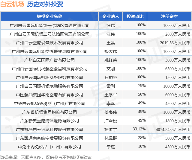 通过天眼查大数据分析,广州白云国际机场股份有限公司共对外投资了21家企业,参与招投标项目12574次;财产线索方面有商标信息190条,专利信息10条,著作权信息11条;此外企业还拥有行政许可186个。据2024年报数据,白云机场长期股权投资7.54亿元,同比增16.08%。