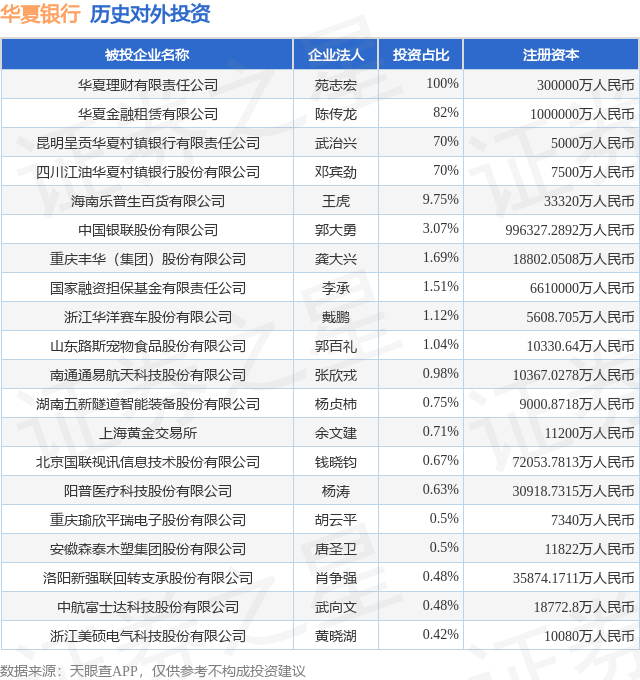 证券之星消息,根据天眼查APP显示,华夏银行(600015.SH)新增一起对外投资事件,被投资公司为安徽森泰木塑集团股份有限公司,法定代表人唐圣卫,投资占比为0.5%。该公司从事木材加工和木、竹、藤、棕、草制品业,注册资本为11822万人民币。目前,华夏银行共存在对外投资37项,投资占比前20的项目见下表: