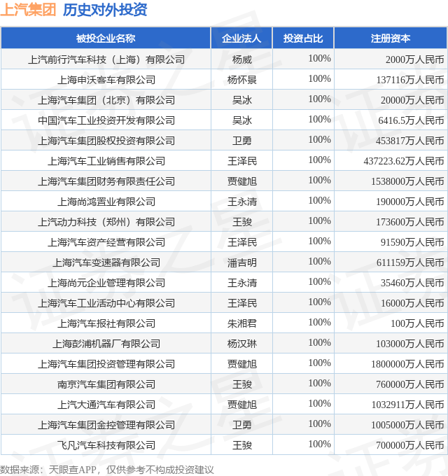 证券之星消息,根据天眼查APP显示,上汽集团(600104.SH)新增一起对外投资事件,被投资公司为上汽前行汽车科技(上海)有限公司,法定代表人杨威,投资占比为100%。该公司从事汽车制造业,注册资本为2000万人民币。目前,上汽集团共存在对外投资54项,投资占比前20的项目见下表:
