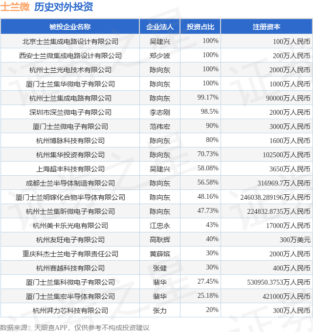 证券之星消息,根据天眼查APP显示,士兰微(600460.SH)新增一起对外投资事件,被投资公司为致瞻科技(上海)有限公司,法定代表人史经奎,投资占比为0.62%。该公司从事批发业,注册资本为1352.2823万人民币。目前,士兰微共存在对外投资30项,投资占比前20的项目见下表: