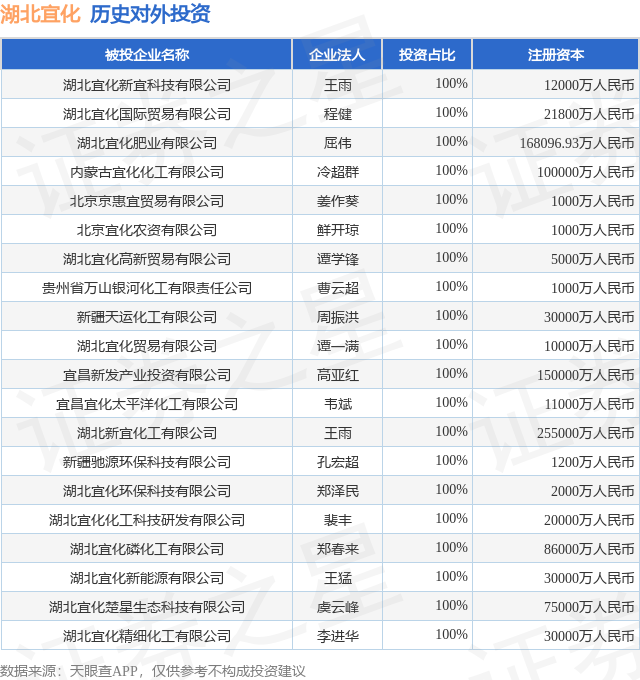 证券之星消息,根据天眼查APP显示,湖北宜化(000422.SZ)新增一起对外投资事件,被投资公司为湖北宜化新宜科技有限公司,法定代表人王雨,投资占比为100%。该公司从事化学原料和化学制品制造业,注册资本为12000万人民币。目前,湖北宜化共存在对外投资32项,投资占比前20的项目见下表:
