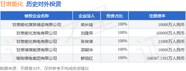 证券之星消息,根据天眼查APP显示,甘肃能化(000552.SZ)新增一起对外投资事件,被投资公司为甘肃能化煤炭储运有限公司,法定代表人樊长娃,投资占比为100%。该公司从事装卸搬运和仓储业,注册资本为10000万人民币。目前,甘肃能化共存在对外投资5项,详见下表: