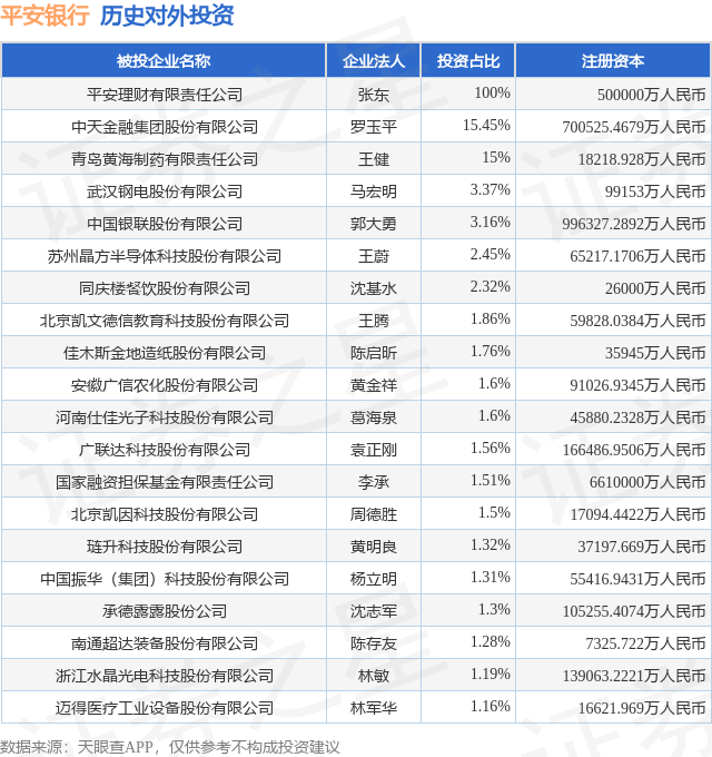 证券之星消息,根据天眼查APP显示,平安银行(000001.SZ)新增一起对外投资事件,被投资公司为河南仕佳光子科技股份有限公司,法定代表人葛海泉,投资占比为1.6%。该公司从事计算机、通信和其他电子设备制造业,注册资本为45880.2328万人民币。目前,平安银行共存在对外投资62项,投资占比前20的项目见下表: