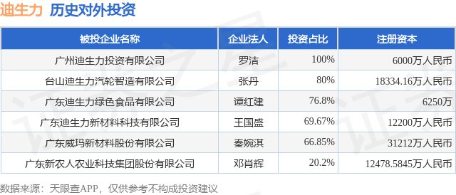 证券之星消息,根据天眼查APP显示,迪生力(603335.SH)新增一起对外投资事件,被投资公司为广东新农人农业科技集团股份有限公司,法定代表人邓肖辉,投资占比为20.2%。该公司从事研究和试验发展,注册资本为12478.5845万人民币。目前,迪生力共存在对外投资6项,详见下表:
