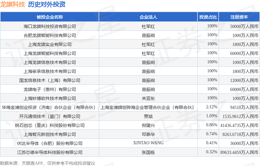 证券之星消息,根据天眼查APP显示,龙旗科技(603341.SH)新增一起对外投资事件,被投资公司为海口龙旗科技投资有限公司,法定代表人杜军红,投资占比为100%。该公司从事商务服务业,注册资本为50000万人民币。目前,龙旗科技共存在对外投资15项,详见下表: