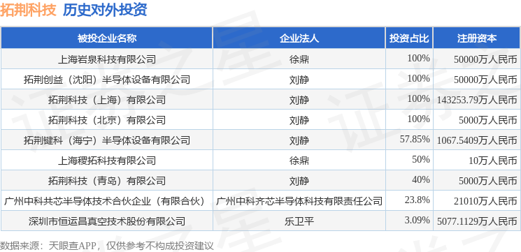 证券之星消息,根据天眼查APP显示,拓荆科技(688072.SH)新增一起对外投资事件,被投资公司为上海稷拓科技有限公司,法定代表人徐鼎,投资占比为50%。该公司从事研究和试验发展,注册资本为10万人民币。目前,拓荆科技共存在对外投资9项,详见下表: