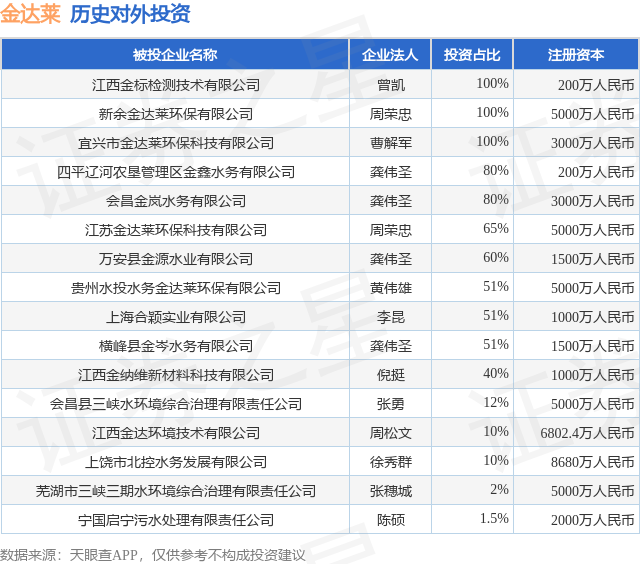 通过天眼查大数据分析,江西金达莱环保股份有限公司共对外投资了26家企业,参与招投标项目769次;财产线索方面有商标信息63条,专利信息159条,著作权信息53条;此外企业还拥有行政许可22个。据2024年报数据,金达莱长期股权投资545.86万元,同比增10.31%。