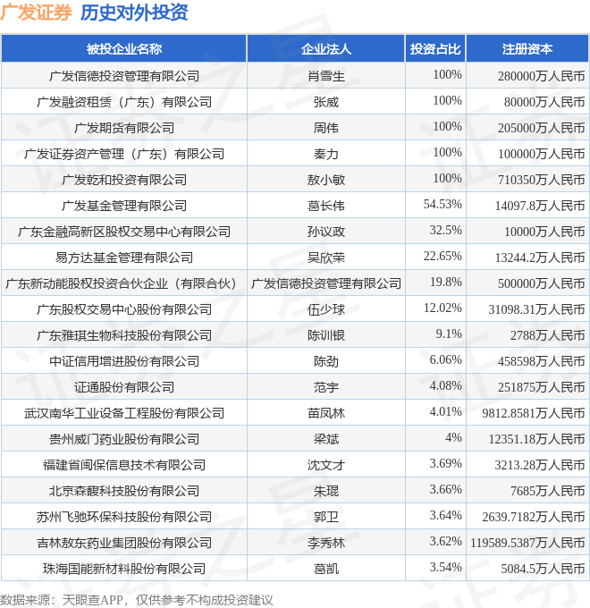 通过天眼查大数据分析,广发证券股份有限公司共对外投资了117家企业,参与招投标项目1991次;财产线索方面有商标信息434条,专利信息155条,著作权信息82条;此外企业还拥有行政许可36个。据2024年报数据,广发证券商誉240.3万元,同比增2.18%。长期股权投资110.07亿元,同比增19.31%。