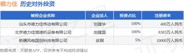 证券之星消息,根据天眼查APP显示,德力佳(603092.SH)新增一起对外投资事件,被投资公司为汕头市德力佳传动有限公司,法定代表人刘建华,投资占比为100%。该公司从事通用设备制造业,注册资本为400万人民币。目前,德力佳共存在对外投资3项,详见下表:
