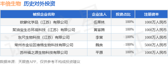 证券之星消息,根据天眼查APP显示,丰倍生物(603334.SH)新增一起对外投资事件,被投资公司为欧蒙化学品(江苏)有限公司,法定代表人伍果林,投资占比为100%。该公司从事批发业,注册资本为1000万人民币。目前,丰倍生物共存在对外投资5项,详见下表: