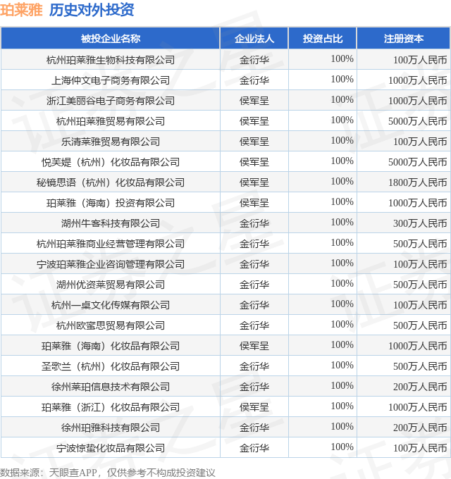 证券之星消息,根据天眼查APP显示,珀莱雅(603605.SH)新增一起对外投资事件,被投资公司为杭州珀莱雅生物科技有限公司,法定代表人金衍华,投资占比为100%。该公司从事研究和试验发展,注册资本为100万人民币。目前,珀莱雅共存在对外投资31项,投资占比前20的项目见下表: