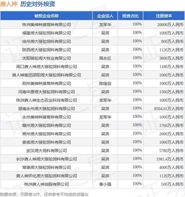 证券之星消息,根据天眼查APP显示,唐人神(002567.SZ)新增一起对外投资事件,被投资公司为韶关韶唐一号农牧股权投资基金有限公司,法定代表人刘珊,投资占比为49.92%。该公司从事资本市场服务,注册资本为12000万人民币。目前,唐人神共存在对外投资83项,投资占比前20的项目见下表: