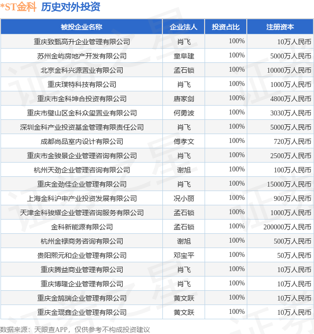 证券之星消息,根据天眼查APP显示,*ST金科(000656.SZ)新增一起对外投资事件,被投资公司为重庆致甄高升企业管理有限公司,法定代表人肖飞,投资占比为100%。该公司从事其他金融业,注册资本为10万人民币。目前,*ST金科共存在对外投资46项,投资占比前20的项目见下表: