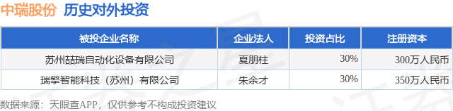 证券之星消息,根据天眼查APP显示,中瑞股份(301587.SZ)新增一起对外投资事件,被投资公司为苏州喆瑞自动化设备有限公司,法定代表人夏朋柱,投资占比为30%。该公司从事专用设备制造业,注册资本为300万人民币。目前,中瑞股份共存在对外投资2项,详见下表: