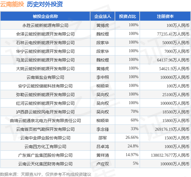 证券之星消息,根据天眼查APP显示,云南能投(002053.SZ)新增一起对外投资事件,被投资公司为永胜云能新能源有限公司,法定代表人黄缚虎,投资占比为100%。该公司从事批发业,注册资本为100万人民币。目前,云南能投共存在对外投资17项,详见下表: