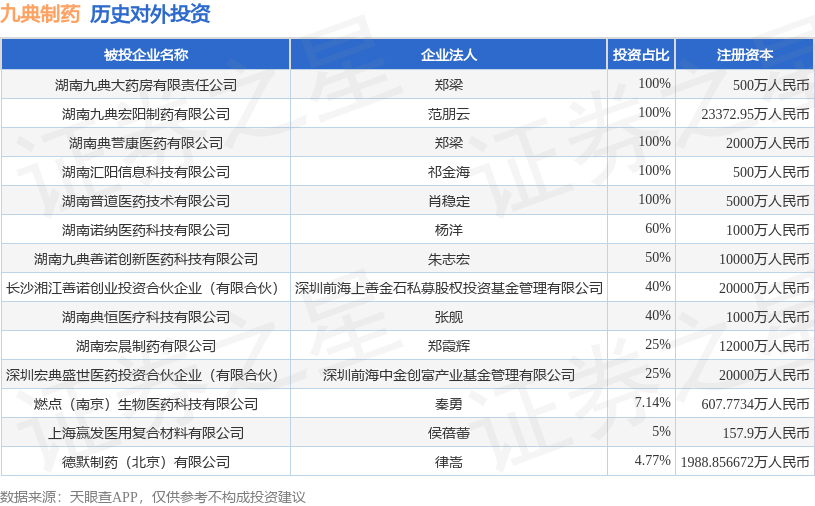证券之星消息,根据天眼查APP显示,九典制药(300705.SZ)新增一起对外投资事件,被投资公司为湖南九典善诺创新医药科技有限公司,法定代表人朱志宏,投资占比为50%。该公司从事研究和试验发展,注册资本为10000万人民币。目前,九典制药共存在对外投资14项,详见下表: