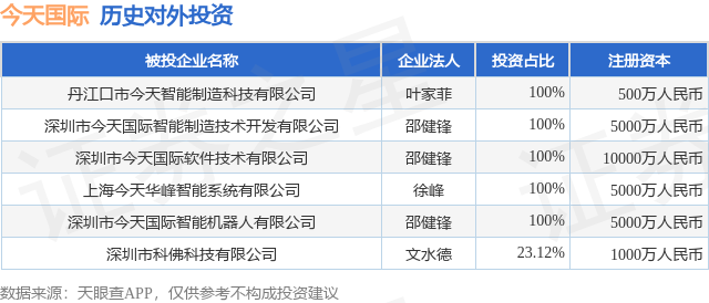 通过天眼查大数据分析,深圳市今天国际物流技术股份有限公司共对外投资了7家企业,参与招投标项目1050次;财产线索方面有商标信息228条,专利信息219条,著作权信息211条;此外企业还拥有行政许可35个。