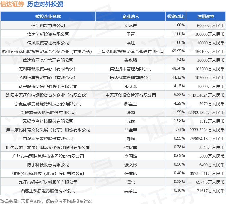 证券之星消息,根据天眼查APP显示,信达证券(601059.SH)新增一起对外投资事件,被投资公司为中煤新集能源股份有限公司,法定代表人刘峰,投资占比为0.95%。该公司从事煤炭开采和洗选业,注册资本为259054.18万人民币。目前,信达证券共存在对外投资20项,详见下表: