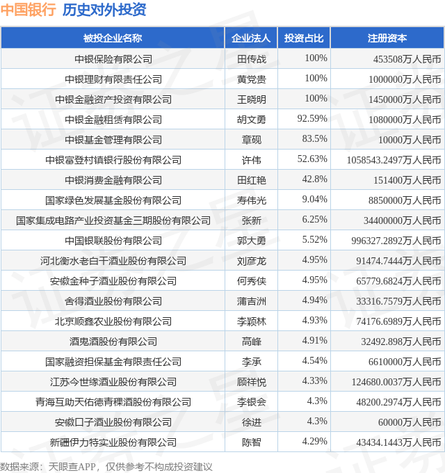 证券之星消息,根据天眼查APP显示,中国银行(601988.SH)新增一起对外投资事件,被投资公司为方正科技集团股份有限公司,法定代表人陈宏良,投资占比为1.08%。该公司从事批发业,注册资本为427374.2887万人民币。目前,中国银行共存在对外投资778项,投资占比前20的项目见下表: