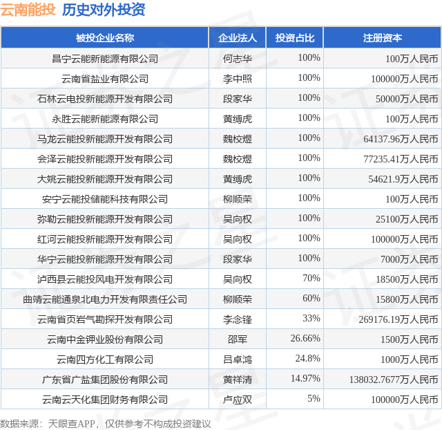 证券之星消息,根据天眼查APP显示,云南能投(002053.SZ)新增一起对外投资事件,被投资公司为昌宁云能新能源有限公司,法定代表人何志华,投资占比为100%。该公司从事批发业,注册资本为100万人民币。目前,云南能投共存在对外投资18项,详见下表: