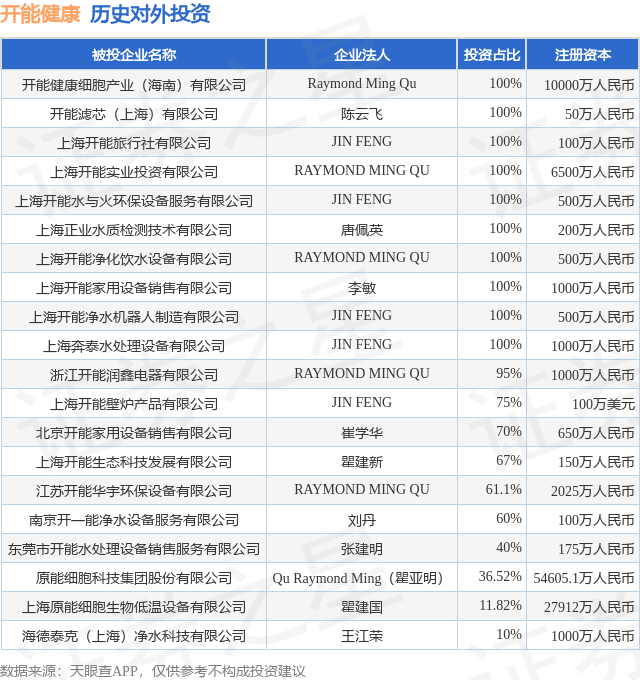 证券之星消息,根据天眼查APP显示,开能健康(300272.SZ)新增一起对外投资事件,被投资公司为开能健康细胞产业(海南)有限公司,法定代表人Raymond Ming Qu,投资占比为100%。该公司从事研究和试验发展,注册资本为10000万人民币。目前,开能健康共存在对外投资21项,投资占比前20的项目见下表: