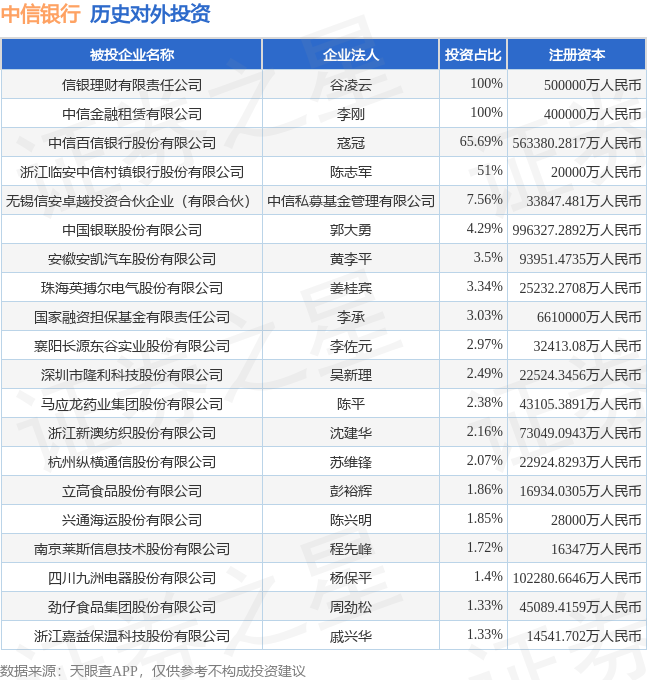 通过天眼查大数据分析,中信银行股份有限公司共对外投资了59家企业,参与招投标项目9759次;财产线索方面有商标信息297条,专利信息1592条,著作权信息950条;此外企业还拥有行政许可154个。据2024年报数据,中信银行商誉9.59亿元,同比增3.56%。长期股权投资73.49亿元,同比增5.82%。