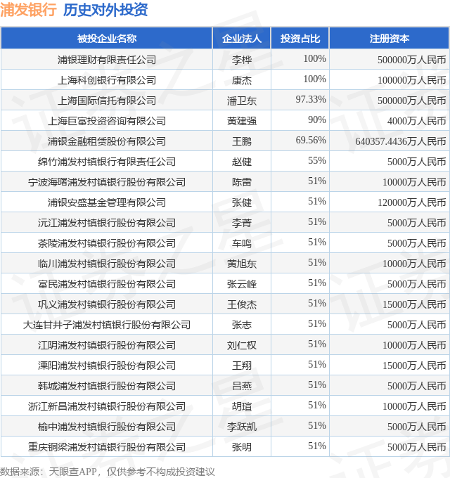 证券之星消息,根据天眼查APP显示,浦发银行(600000.SH)新增一起对外投资事件,被投资公司为上海南芯半导体科技股份有限公司,法定代表人阮晨杰,投资占比为1.22%。该公司从事计算机、通信和其他电子设备制造业,注册资本为42570.2911万人民币。目前,浦发银行共存在对外投资225项,投资占比前20的项目见下表: