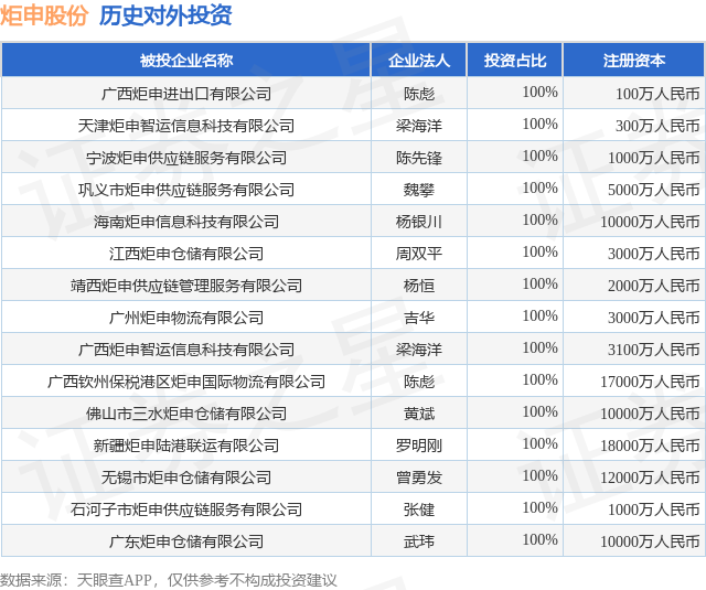 证券之星消息,根据天眼查APP显示,炬申股份(001202.SZ)新增一起对外投资事件,被投资公司为广西炬申进出口有限公司,法定代表人陈彪,投资占比为100%。该公司从事批发业,注册资本为100万人民币。目前,炬申股份共存在对外投资15项,详见下表: