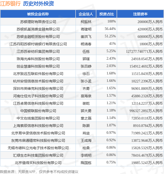 证券之星消息,根据天眼查APP显示,江苏银行(600919.SH)新增一起对外投资事件,被投资公司为凯撒同盛发展股份有限公司,法定代表人迟永杰,投资占比为0.67%。该公司从事新闻和出版业,注册资本为80300.0258万人民币。目前,江苏银行共存在对外投资40项,投资占比前20的项目见下表: