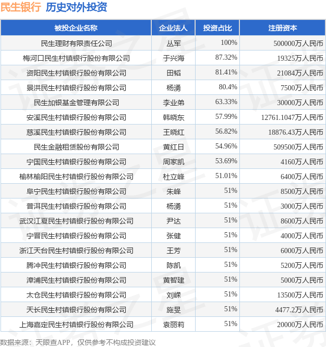 证券之星消息,根据天眼查APP显示,民生银行(600016.SH)新增一起对外投资事件,被投资公司为深圳万讯自控股份有限公司,法定代表人傅宇晨,投资占比为0.5%。该公司从事仪器仪表制造业,注册资本为29194.3278万人民币。目前,民生银行共存在对外投资177项,投资占比前20的项目见下表: