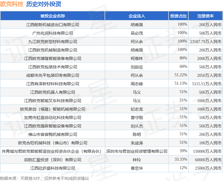 证券之星消息,根据天眼查APP显示,欧克科技(001223.SZ)新增一起对外投资事件,被投资公司为欧克泉创(福建)智能机械有限公司,法定代表人纪志龙,投资占比为51%。该公司从事计算机、通信和其他电子设备制造业,注册资本为1000万人民币。目前,欧克科技共存在对外投资18项,详见下表: