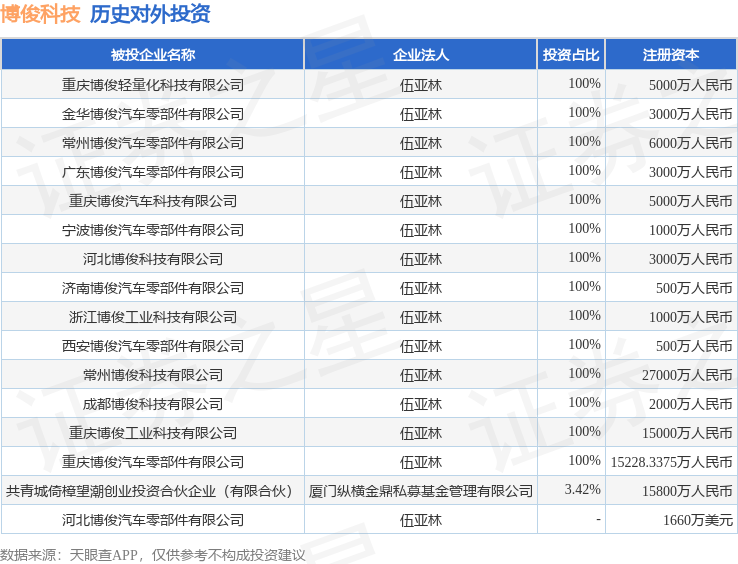 证券之星消息,根据天眼查APP显示,博俊科技(300926.SZ)新增一起对外投资事件,被投资公司为共青城倚樟望潮创业投资合伙企业(有限合伙),法定代表人厦门纵横金鼎私募基金管理有限公司,投资占比为3.42%。该公司从事商务服务业,注册资本为15800万人民币。目前,博俊科技共存在对外投资16项,详见下表: