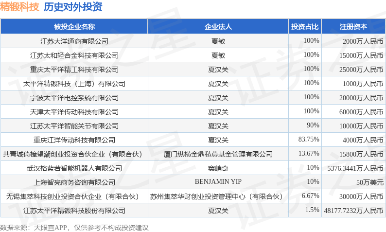证券之星消息,根据天眼查APP显示,精锻科技(300258.SZ)新增一起对外投资事件,被投资公司为共青城倚樟望潮创业投资合伙企业(有限合伙),法定代表人厦门纵横金鼎私募基金管理有限公司,投资占比为13.67%。该公司从事商务服务业,注册资本为15800万人民币。目前,精锻科技共存在对外投资13项,详见下表: