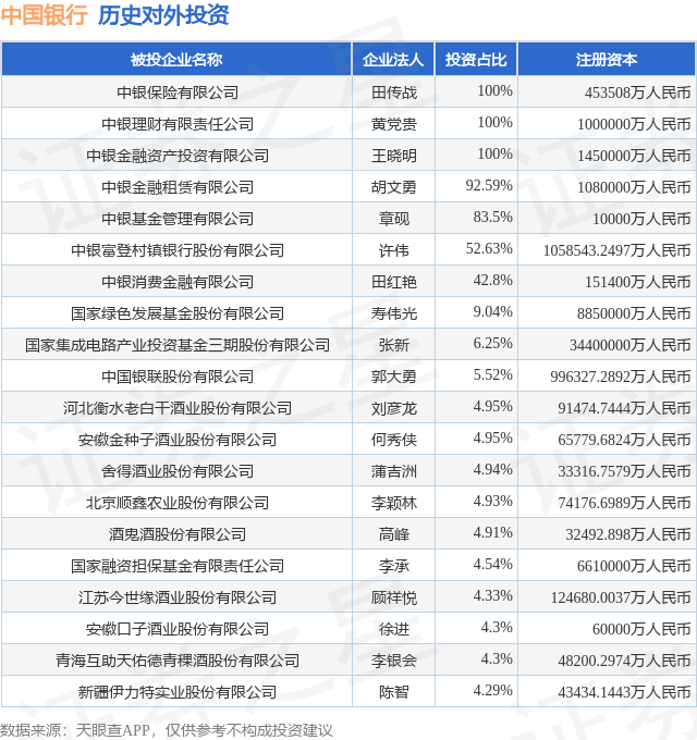 通过天眼查大数据分析,中国银行股份有限公司共对外投资了529家企业,参与招投标项目13944次;财产线索方面有商标信息1929条,专利信息13064条,著作权信息212条;此外企业还拥有行政许可250个。据2024年报数据,中国银行商誉28.28亿元,同比增5.33%。长期股权投资409.72亿元,同比增3.6%。