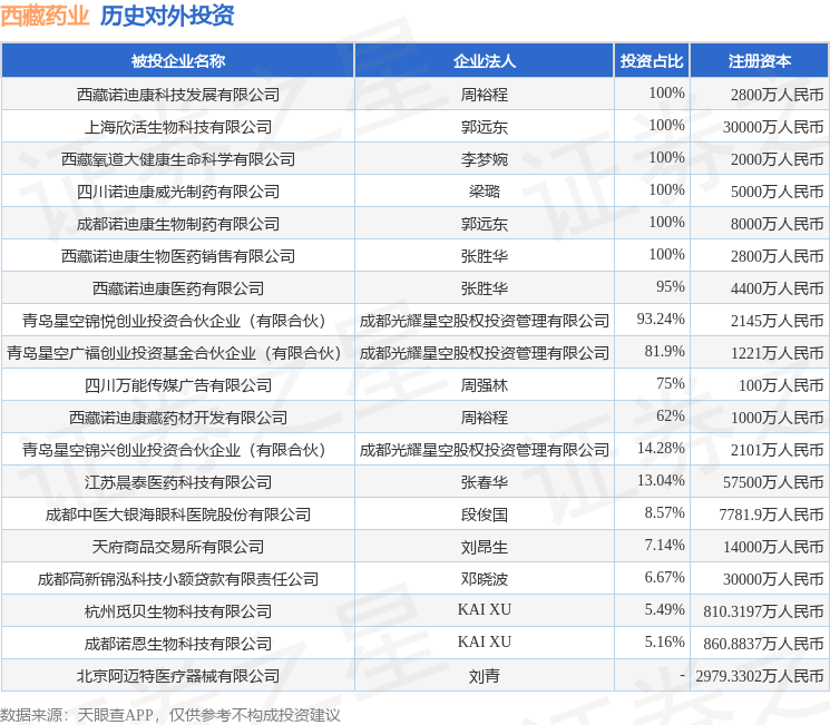 证券之星消息,根据天眼查APP显示,西藏药业(600211.SH)新增一起对外投资事件,被投资公司为青岛星空锦兴创业投资合伙企业(有限合伙),法定代表人成都光耀星空股权投资管理有限公司,投资占比为14.28%。该公司从事资本市场服务,注册资本为2101万人民币。目前,西藏药业共存在对外投资19项,详见下表:
