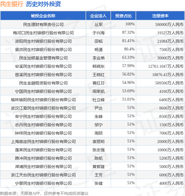 证券之星消息,根据天眼查APP显示,民生银行(600016.SH)新增一起对外投资事件,被投资公司为浙江华康药业股份有限公司,法定代表人陈德水,投资占比为1.2%。该公司从事医药制造业,注册资本为30304.8234万人民币。目前,民生银行共存在对外投资191项,投资占比前20的项目见下表: