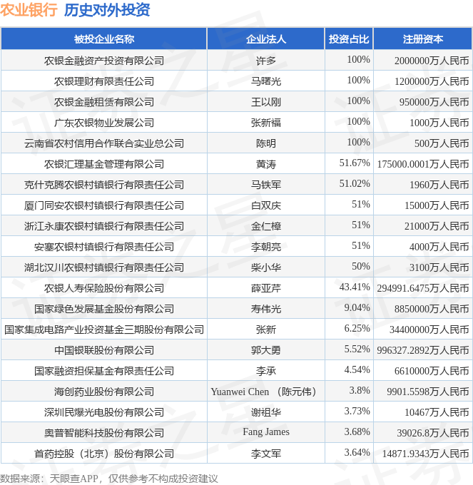 通过天眼查大数据分析,中国农业银行股份有限公司共对外投资了599家企业,参与招投标项目34588次;财产线索方面有商标信息1641条,专利信息5506条,著作权信息99条;此外企业还拥有行政许可119个。据2024年报数据,农业银行商誉13.81亿元,同比未变化。长期股权投资103.32亿元,同比增23.21%。