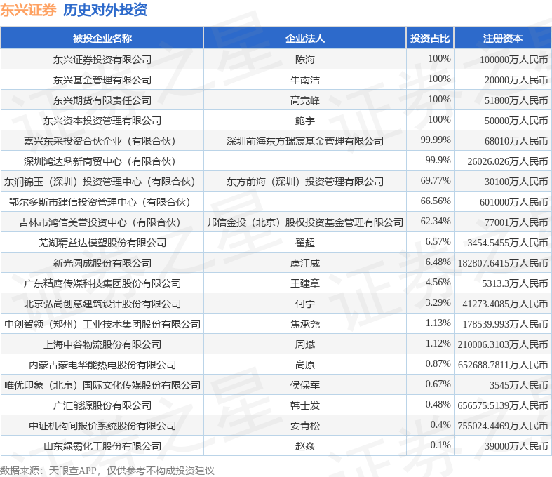 通过天眼查大数据分析,东兴证券股份有限公司共对外投资了27家企业,参与招投标项目792次;财产线索方面有商标信息251条,著作权信息12条;此外企业还拥有行政许可14个。据2024年报数据,东兴证券长期股权投资3.2亿元,同比减5.02%。