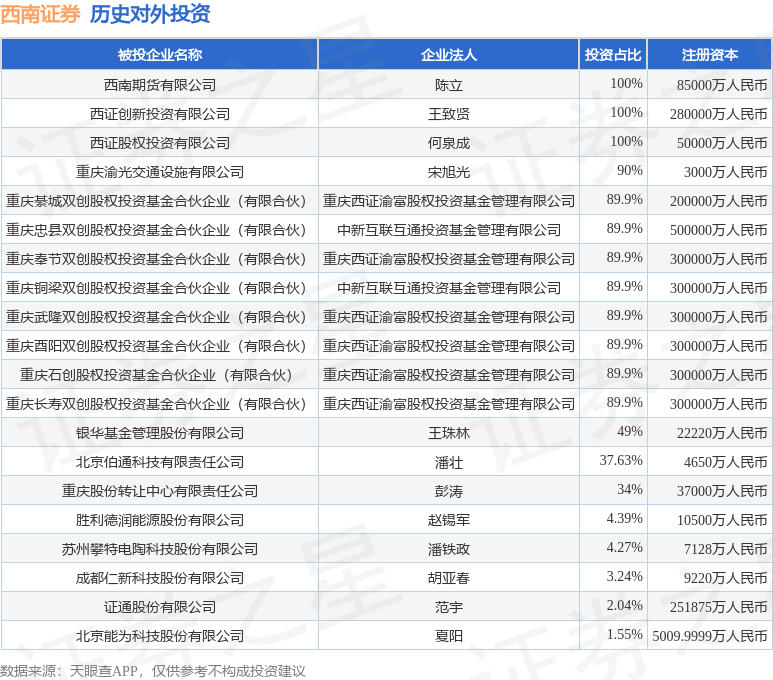 证券之星消息,根据天眼查APP显示,西南证券(600369.SH)新增一起对外投资事件,被投资公司为重庆三峰环境集团股份有限公司,法定代表人廖高尚,投资占比为0.37%。该公司从事生态保护和环境治理业,注册资本为167193.33万人民币。目前,西南证券共存在对外投资30项,投资占比前20的项目见下表:
