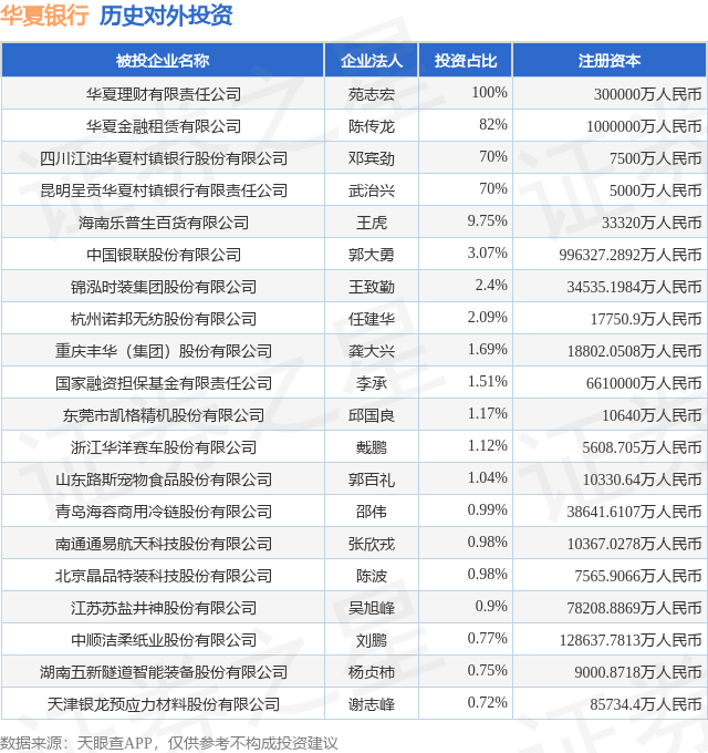 证券之星消息,根据天眼查APP显示,华夏银行(600015.SH)新增一起对外投资事件,被投资公司为北京晶品特装科技股份有限公司,法定代表人陈波,投资占比为0.98%。该公司从事水利管理业,注册资本为7565.9066万人民币。目前,华夏银行共存在对外投资64项,投资占比前20的项目见下表:
