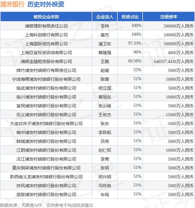 证券之星消息,根据天眼查APP显示,浦发银行(600000.SH)新增一起对外投资事件,被投资公司为广东申菱环境系统股份有限公司,法定代表人崔颖琦,投资占比为1.25%。该公司从事专用设备制造业,注册资本为26605.2564万人民币。目前,浦发银行共存在对外投资253项,投资占比前20的项目见下表: