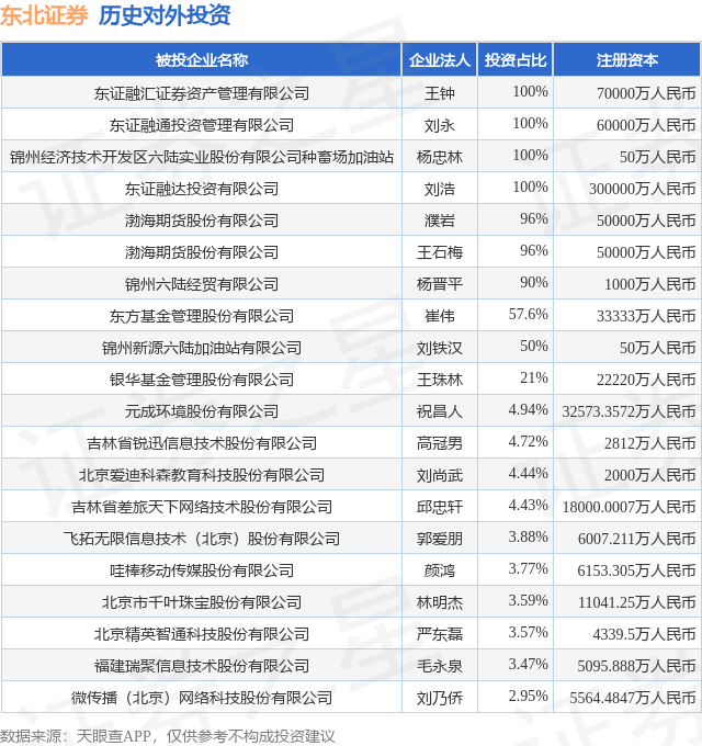 证券之星消息,根据天眼查APP显示,东北证券(000686.SZ)新增一起对外投资事件,被投资公司为元成环境股份有限公司,法定代表人祝昌人,投资占比为4.94%。该公司从事土木工程建筑业,注册资本为32573.3572万人民币。目前,东北证券共存在对外投资52项,投资占比前20的项目见下表:
