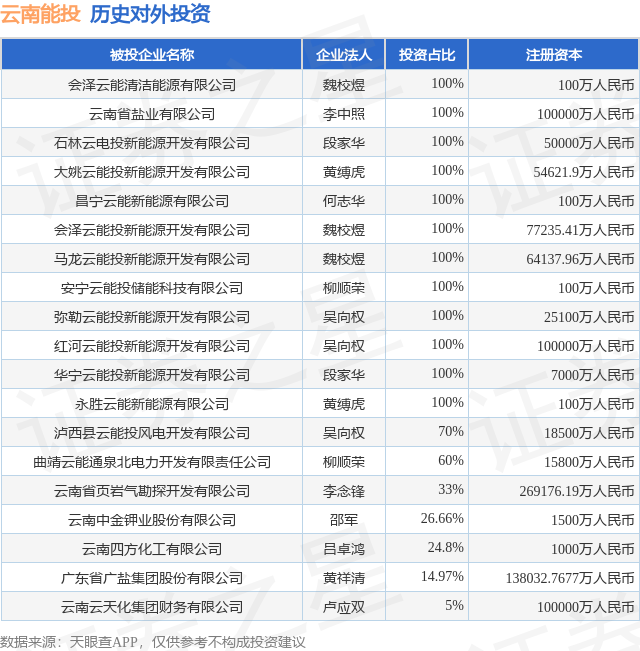 证券之星消息,根据天眼查APP显示,云南能投(002053.SZ)新增一起对外投资事件,被投资公司为会泽云能清洁能源有限公司,法定代表人魏校煜,投资占比为100%。该公司从事电力、热力生产和供应业,注册资本为100万人民币。目前,云南能投共存在对外投资19项,详见下表: