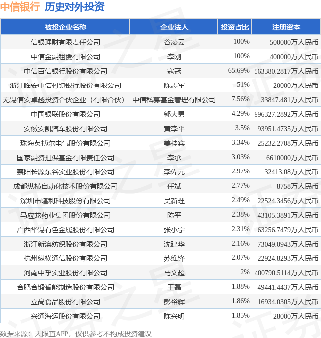证券之星消息,根据天眼查APP显示,中信银行(601998.SH)新增一起对外投资事件,被投资公司为深圳市泛海统联精密制造股份有限公司,法定代表人杨虎,投资占比为1.75%。该公司从事有色金属冶炼和压延加工业,注册资本为15996.3546万人民币。目前,中信银行共存在对外投资116项,投资占比前20的项目见下表: